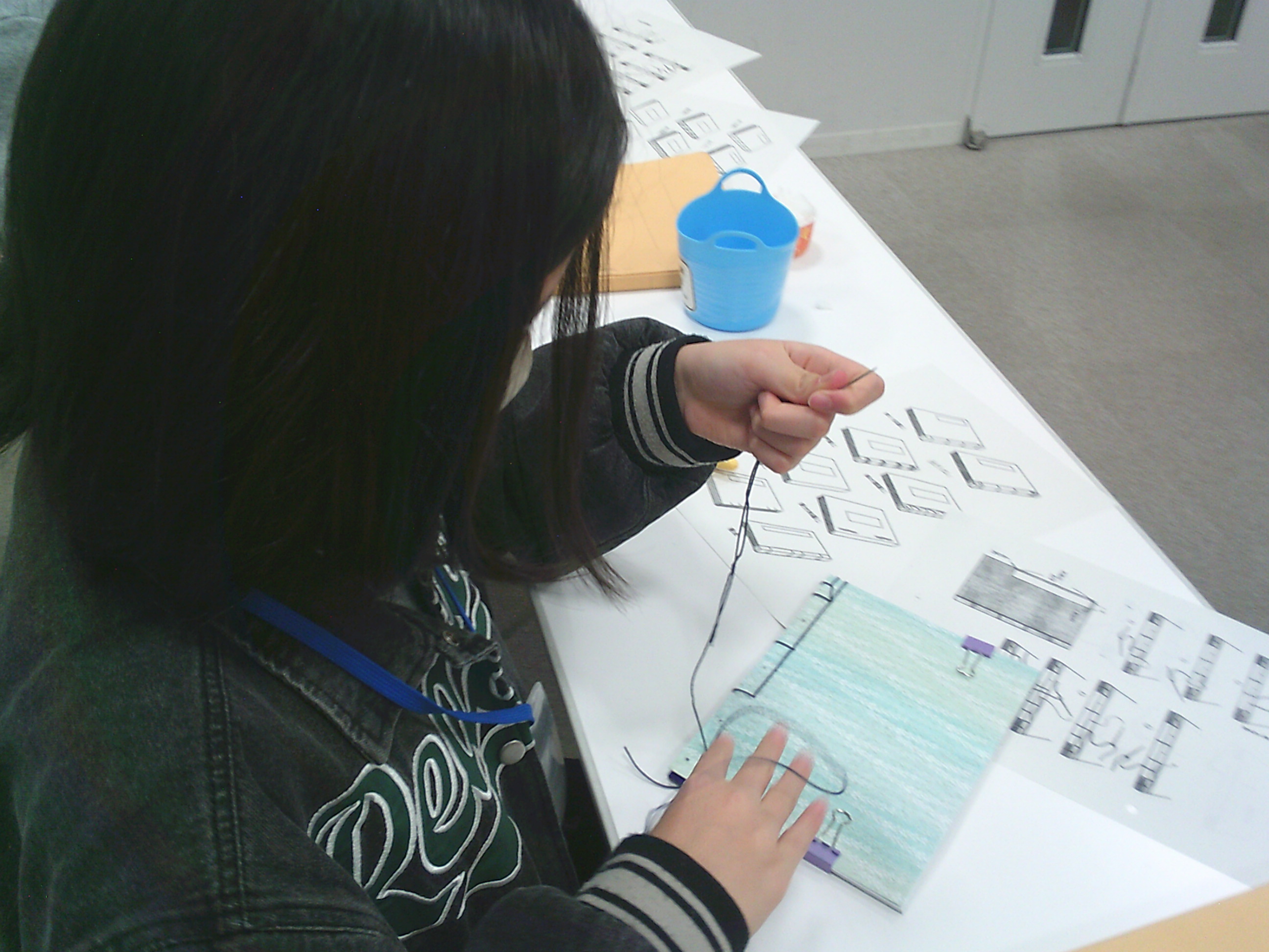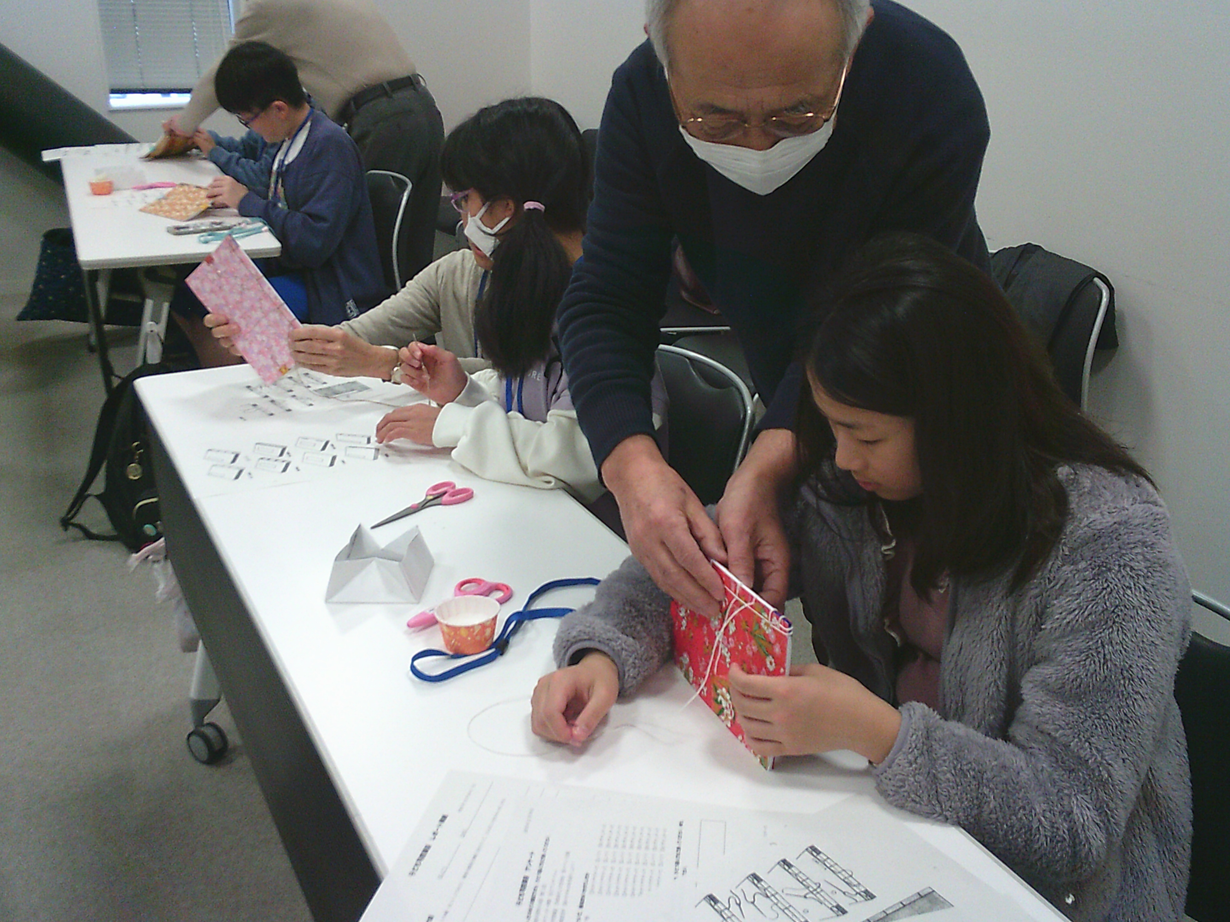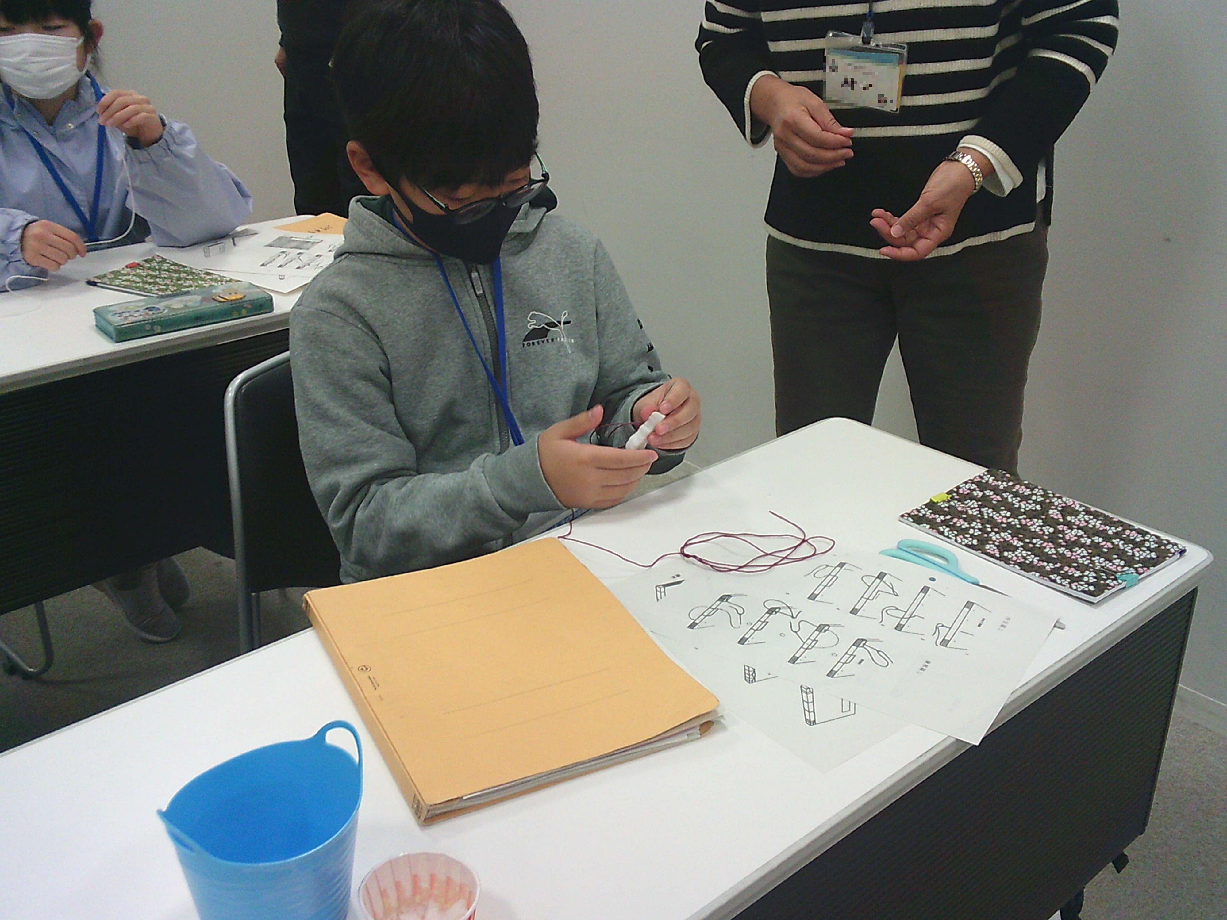 針を順序通り刺していきます。順番が複雑なため、次に針を通す穴がわからなくなってしまった子も。配布されたプリントを確認したり、ブック・ラボさんに助けてもらいながら作っていきます。