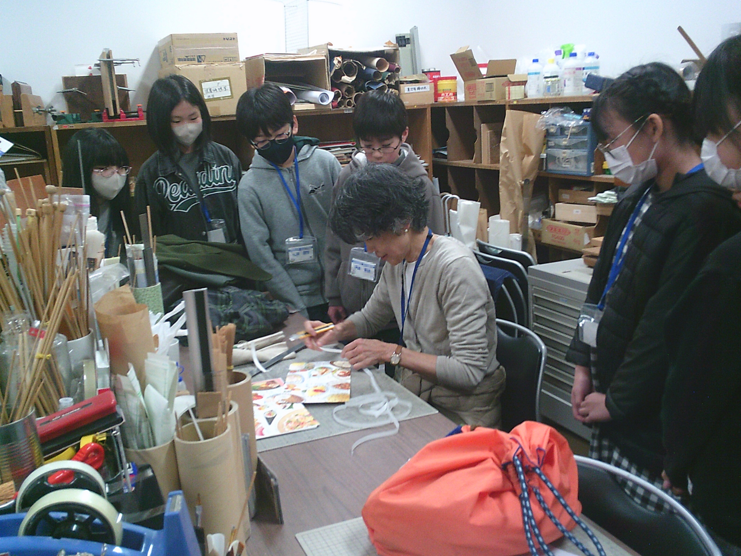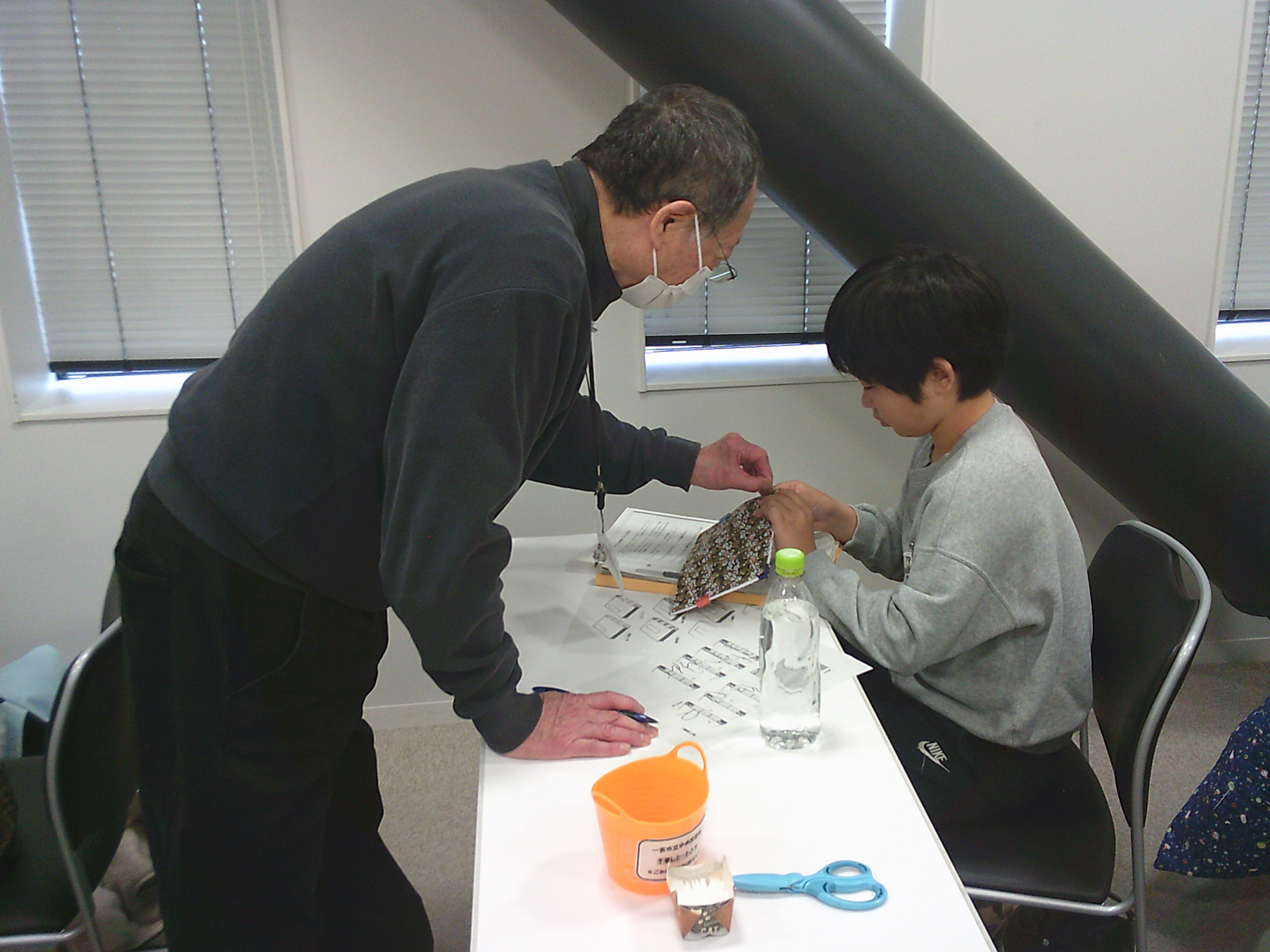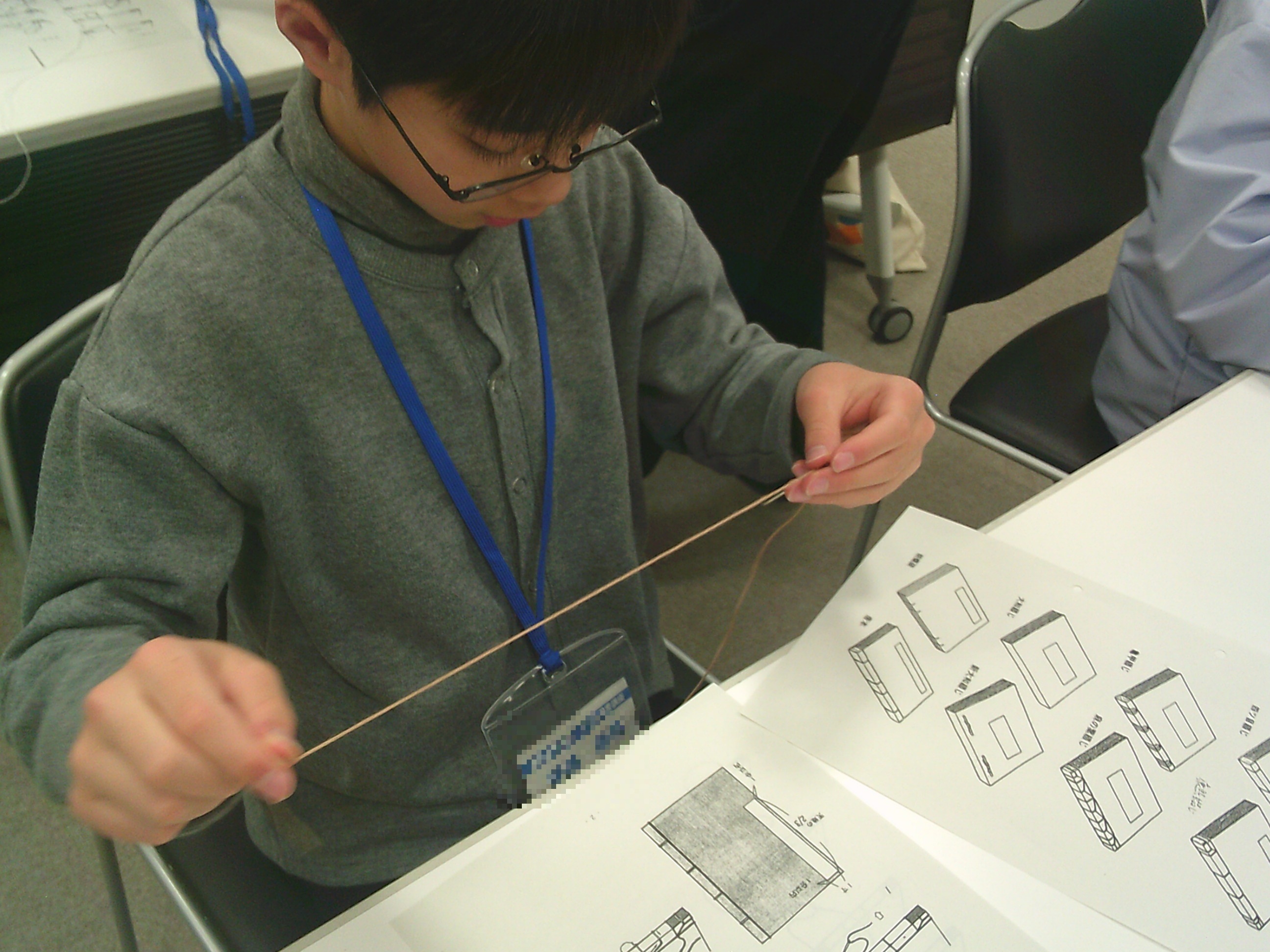 針を順序通り刺していきます。順番が複雑なため、次に針を通す穴がわからなくなってしまった子も。配布されたプリントを確認したり、ブック・ラボさんに助けてもらいながら作っていきます。