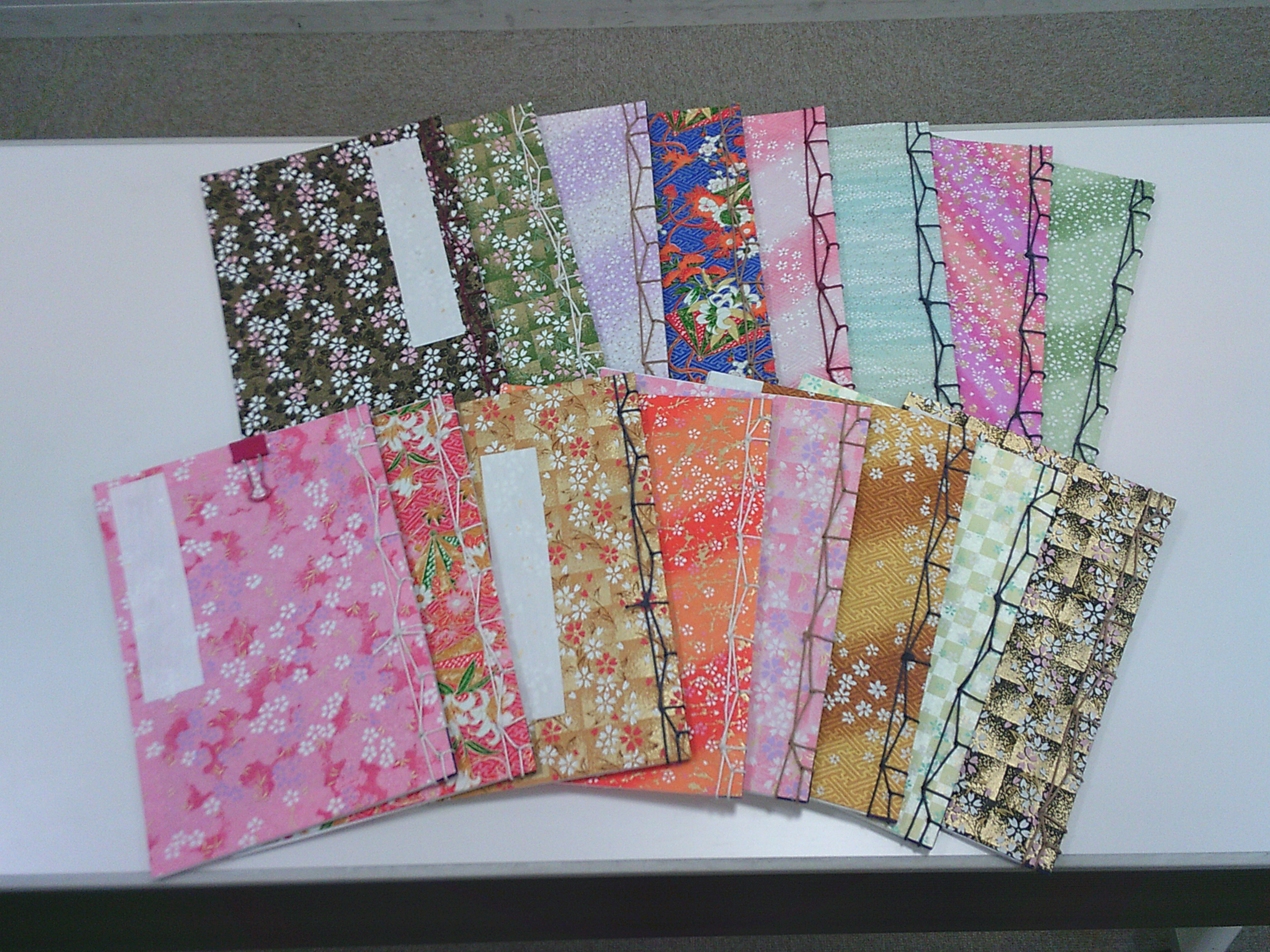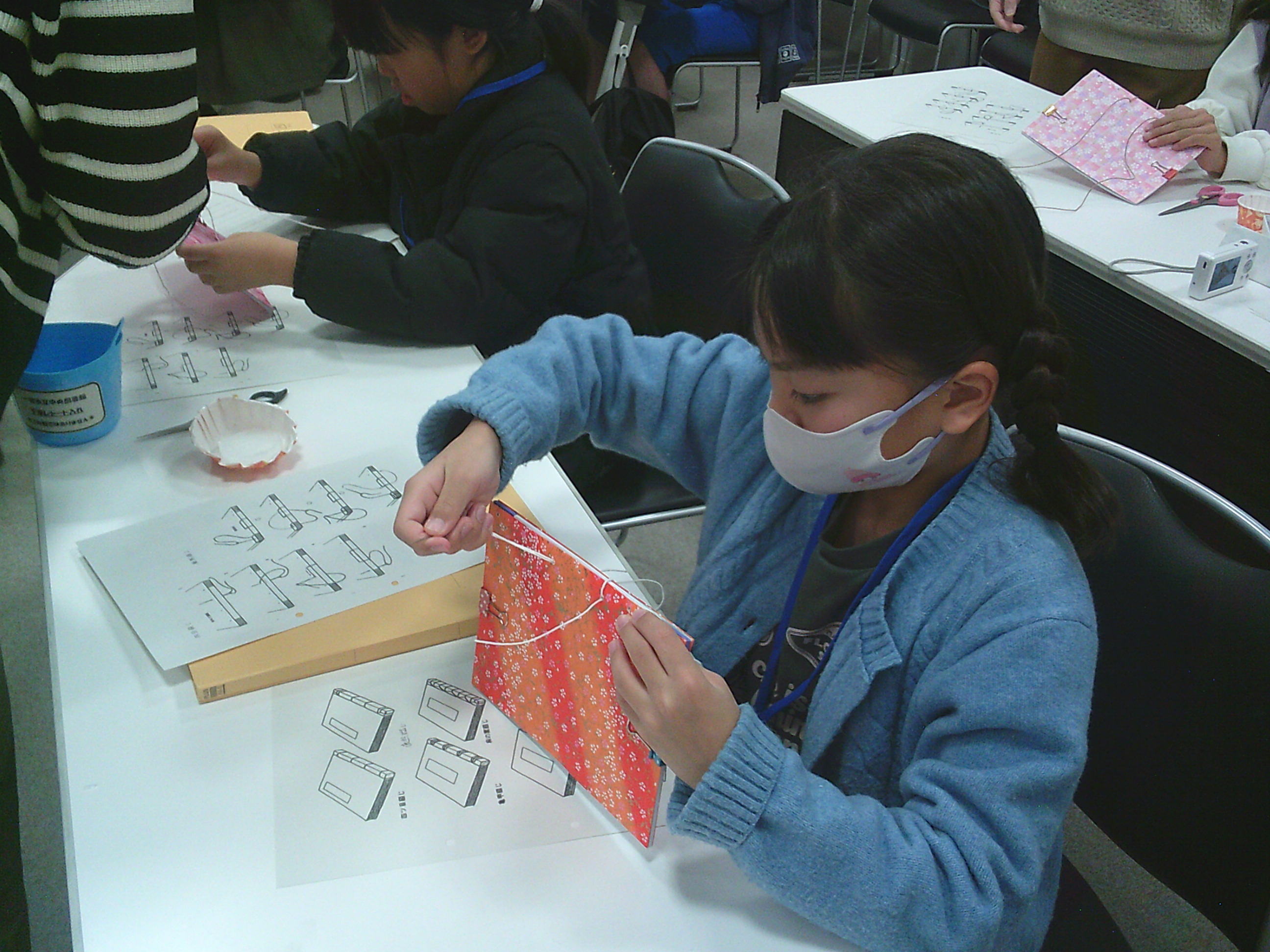 表紙は、きれいな和紙で作られており、糸も赤・白・黒などさまざまです。自分だけの本を作ることができました。ちなみに、中はメモ帳になっています。