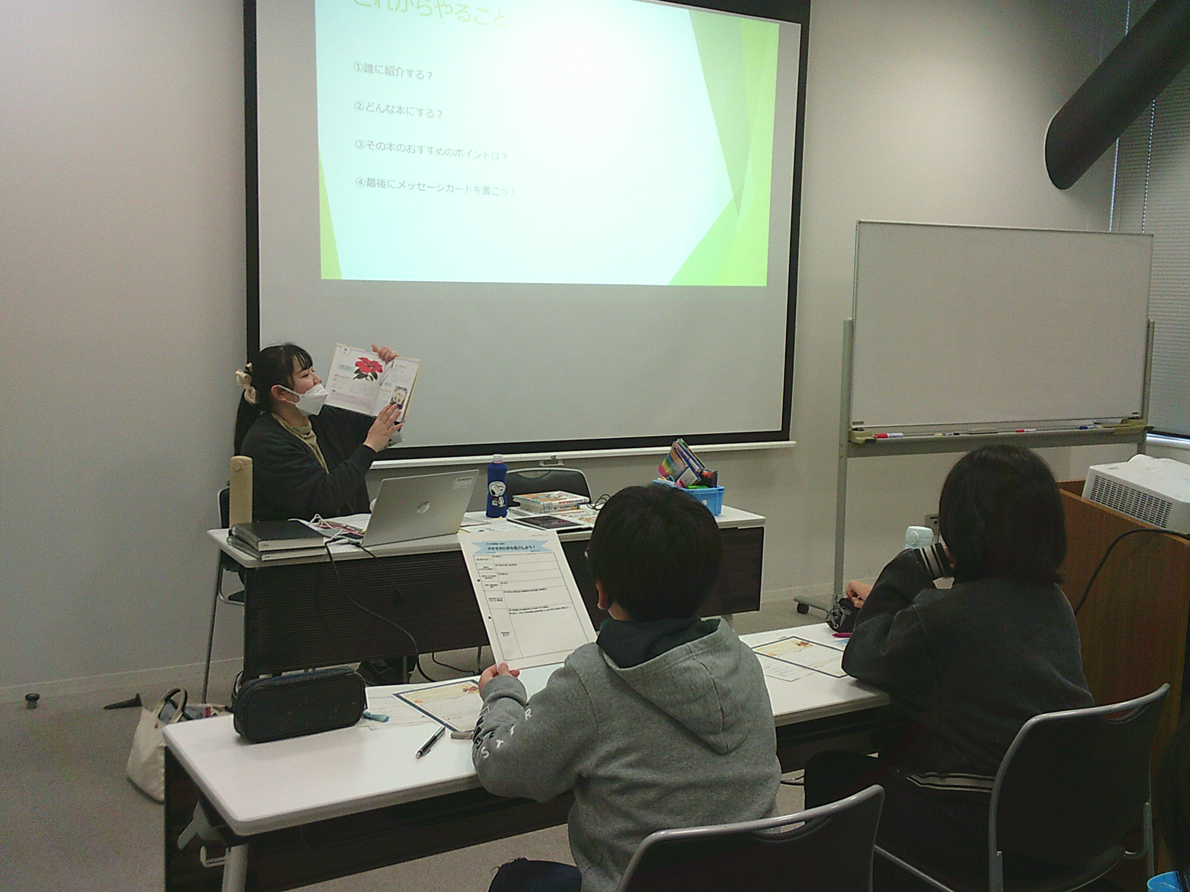 午後からは、「おすすめの本を紹介しよう!」ということで、相手を決めておすすめの本を紹介し、メッセージカードを書きました。